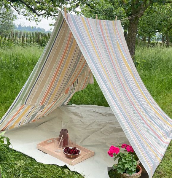 Avec une corde solide, une nappe et quelques pinces, vous pouvez facilement fabriquer votre propre tente tipi pour l’été. Pour jouer, lire ou pique-niquer à l'abri du soleil dans le jardin ou dans un parc !