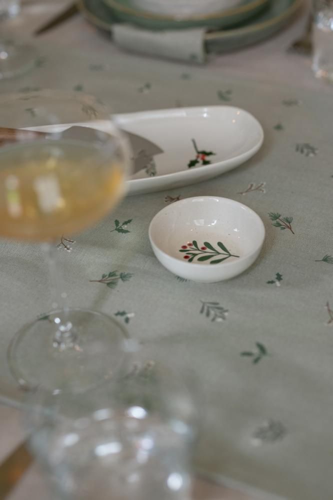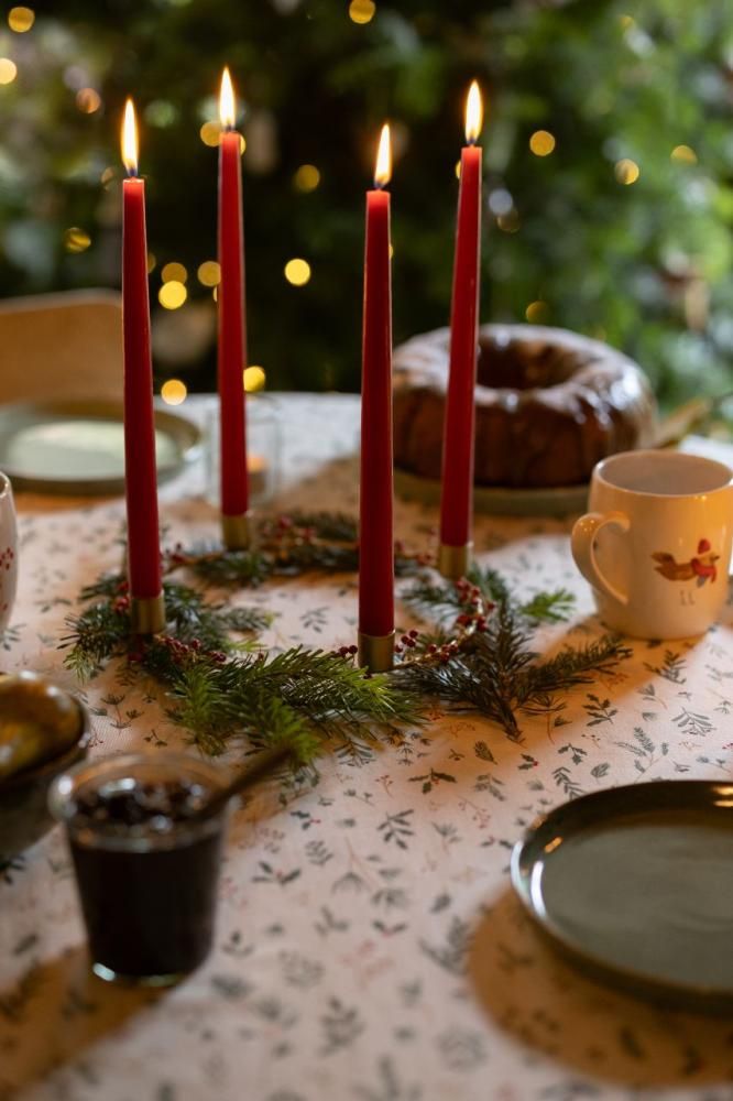Pour créer une véritable ambiance de Noël, choisissez des textiles de table dans les couleurs traditionnelles de Noël rouge et vert. La base de la table sera la nappe avec imprimé de branches de pin. Ou optez pour une nappe blanche sur laquelle vous posez un chemin de table et/ou des serviettes de table dans cet imprimé.