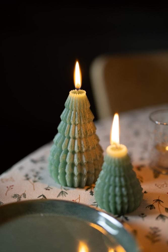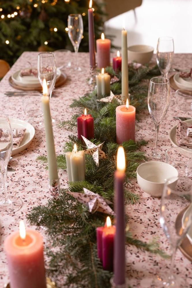 - Combinez des bougies de table longues et courtes avec des bougies en forme de sapin ou d’étoile et des bougies bloc. Ajoutez une touche végétale avec des brins de verdure de Noël disposées en guirlande au centre de la table et réaliser une composition de Noël.