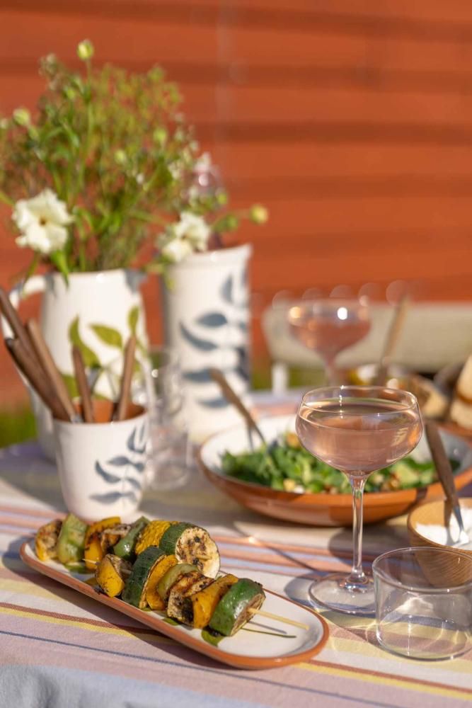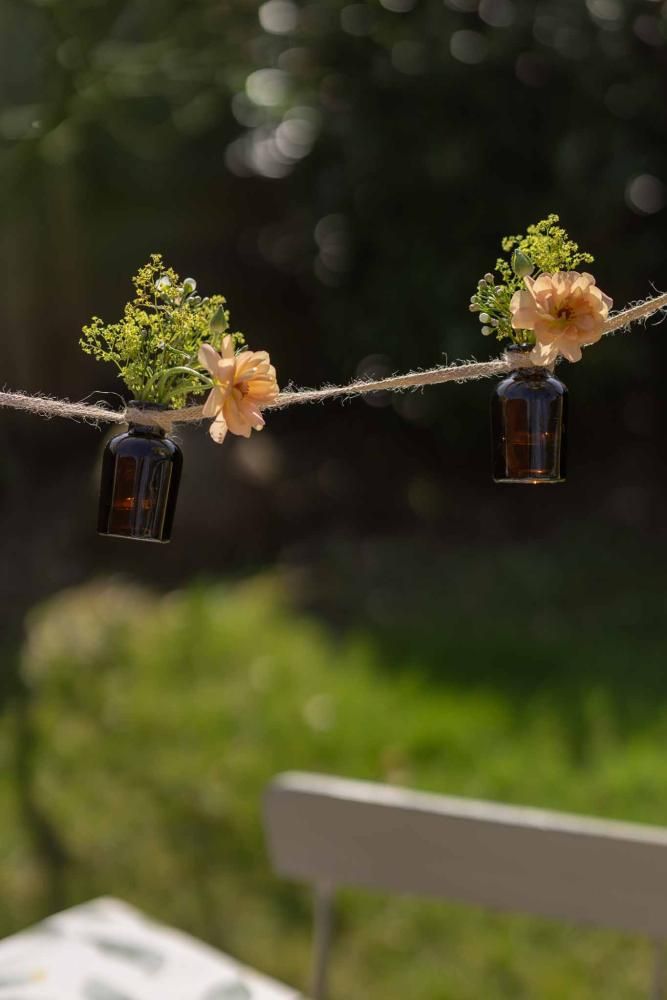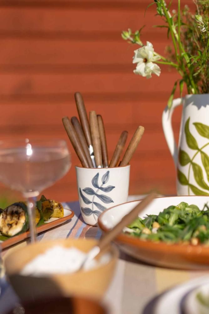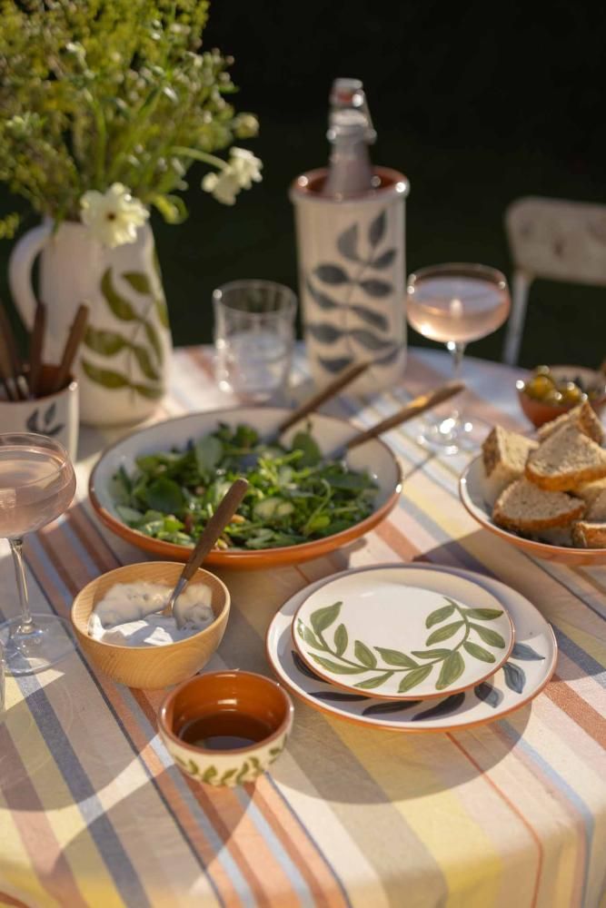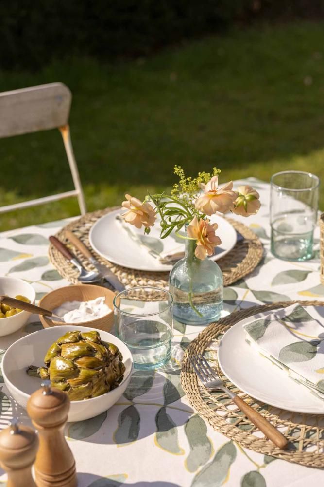 À vous de jouer maintenant, laissez libre cours à votre imagination et créativité ! Gardez suffisamment de place pour ces bons petits plats que vous voulez mettre sur la table. Cette année, nous avons imaginé un merveilleux repas composé d’un tajine et de 3 déclinaisons de houmous que nous présenterons dans des plats en terre cuite. Ces magnifiques plats apporteront saveur et couleur à la table ! Pour le reste, rendez votre extérieur merveilleusement convivial et estival avec des photophores, des bougies et une guirlande de jardin. Découvrez ici comment fabriquer vous-même une guirlande de jardin. Enfin, la cruche en terre cuite peut faire office de vase pour un magnifique bouquet champêtre.