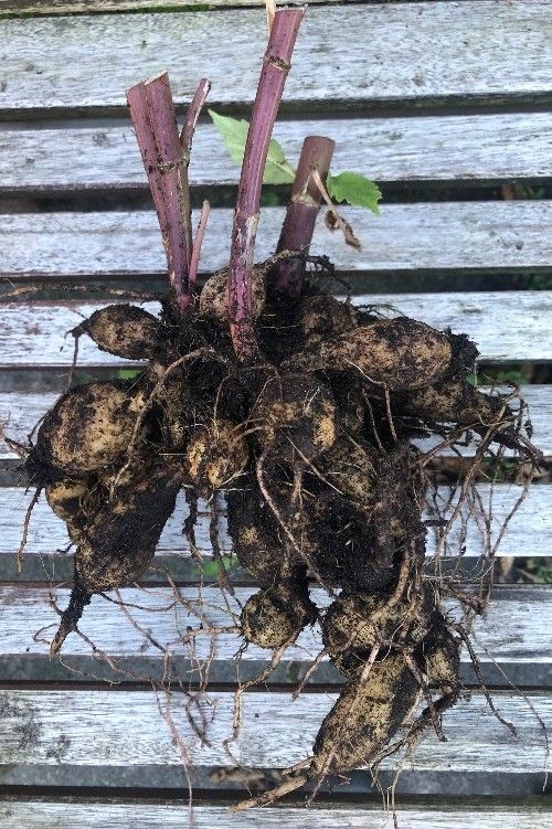 La méthode à suivre si vous n'avez pas de place pour stocker les pots, ou si vos dahlias sont en pleine terre. Coupez les tiges à environ 10 cm du sol et déplantez la motte du pot ou du jardin. Enlevez soigneusement la plus grande partie de la terre entre les tubercules – utilisez un bâtonnet en bois pour plus de facilité. Coupez également les longs rhizomes en faisant attention à ne pas abîmer les tubercules. Vous avez maintenant un morceau de tige auquel est attaché une « bouquet » de tubercules allongés. Placez-les sur un journal pendant un jour ou deux pour les faire sécher, avec la tige vers le bas pour que l'eau s'écoule.