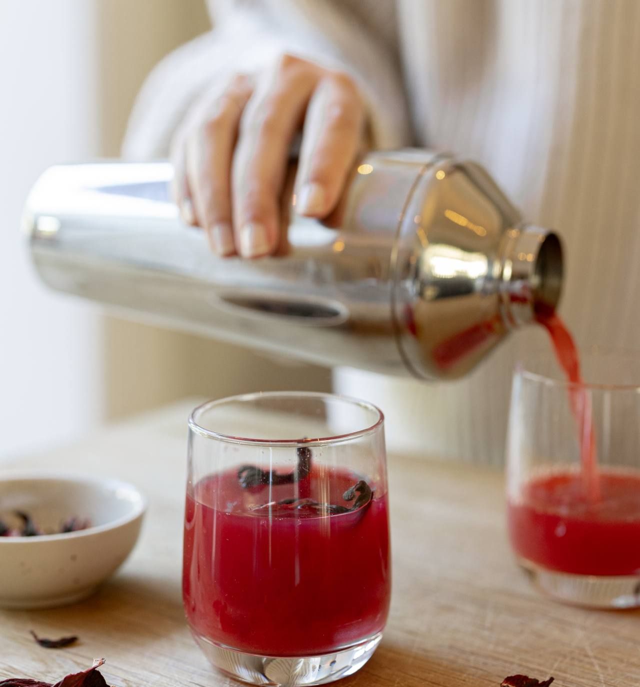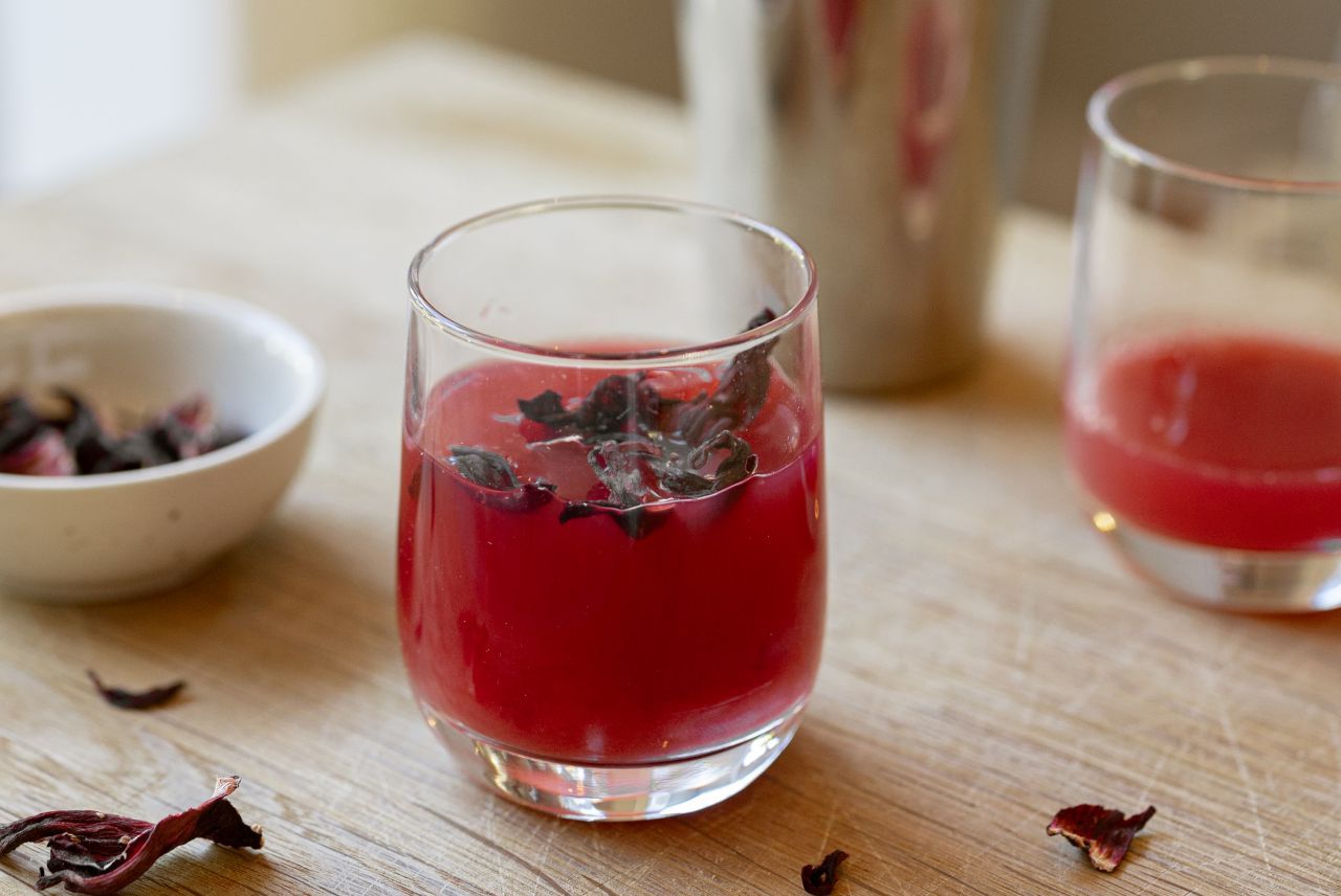 - Versez le mocktail hibiscus-cranberry dans les verres (la passoire dans le bouchon du shaker retiendra l'hibiscus).