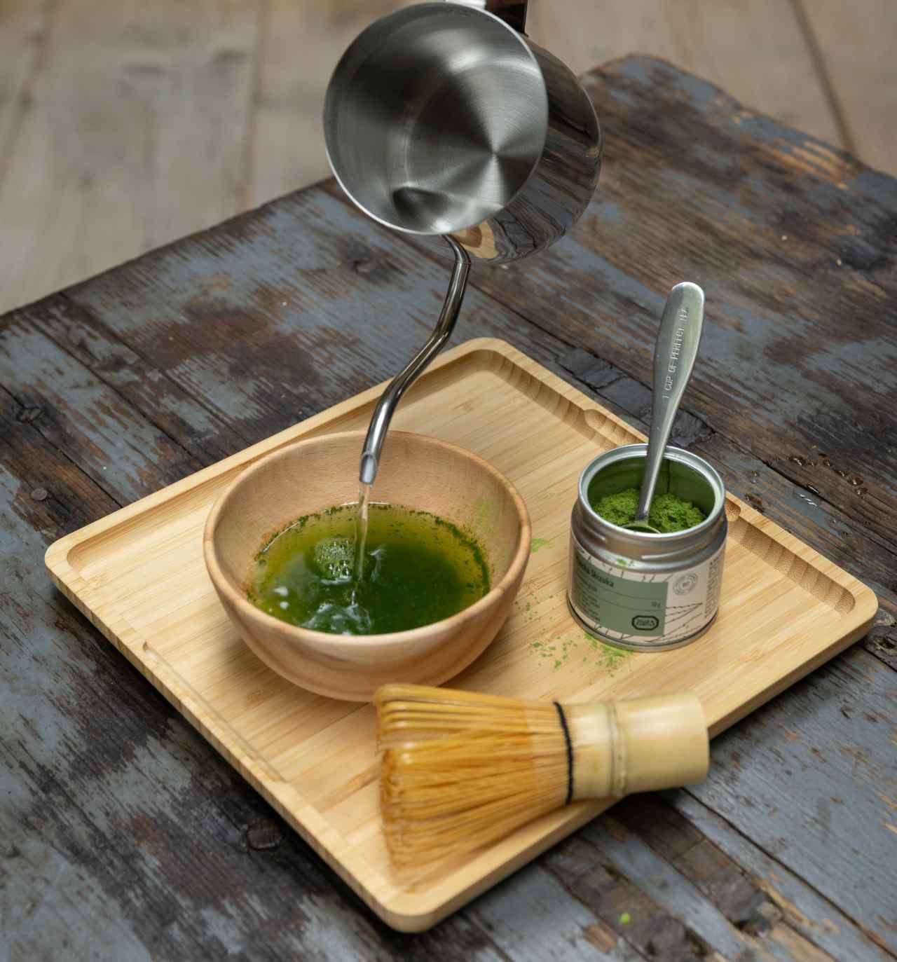 - Faites bouillir l'eau et laissez-la refroidir environ 5 minutes jusqu'à environ 80 °C (une eau trop chaude peut rendre le matcha amer).