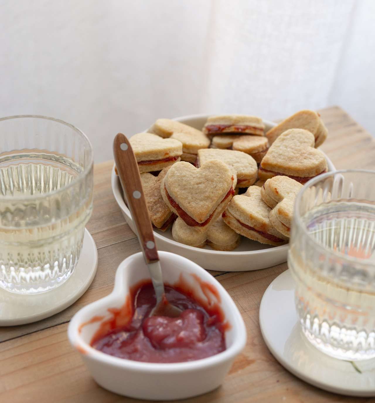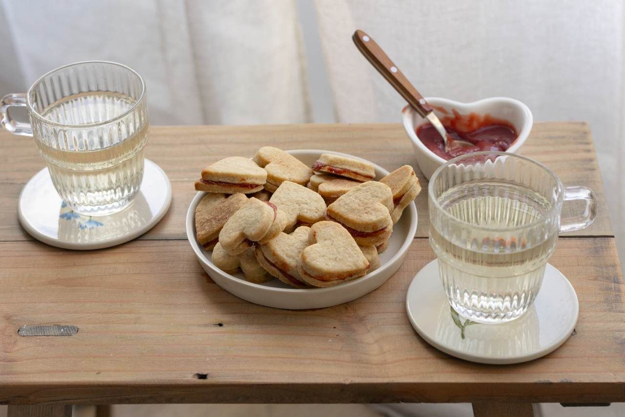 - Étalez une fine couche de strawberry curd sur les biscuits, recouvrez d'un autre biscuit en forme de cœur et pressez délicatement.