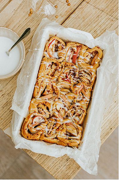 - Réalisez le glaçage en incorporant un peu d’eau à du sucre glace et garnissez-en les bouquets de pommes à la sortie du four.