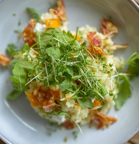 Risotto au potiron, au fromage de chèvre et à la pancetta