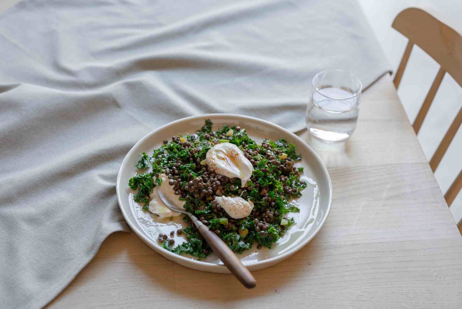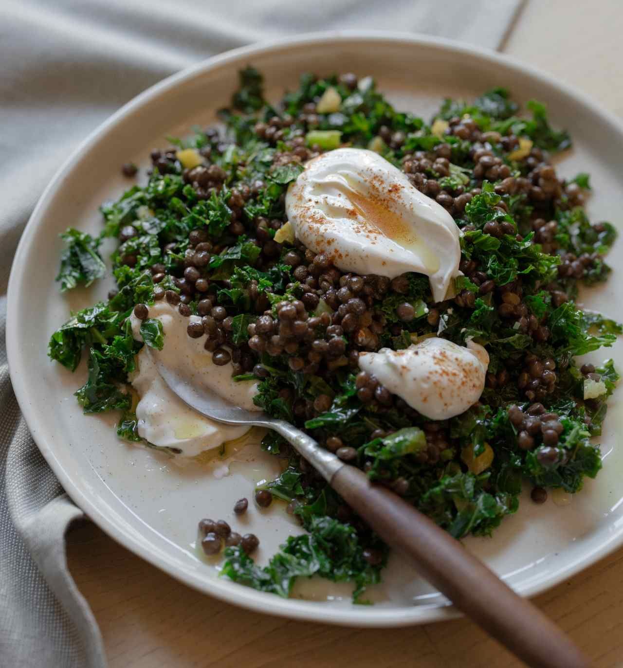 - Répartissez le mijoté de chou kale et de lentilles entre les assiettes, servez avec une cuillère de yaourt et garnissez de persil et d'une tranche de citron confit.